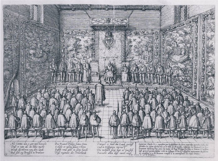 Les États Généraux trouvent leur origine au XVe siècle en tant que conseil traditionnel des domaines pouvant être convoqué par les seigneurs bourguignons des Pays-Bas. Les États généraux étaient constitués de représentants des différentes régions, ou provinces, sur lesquelles s’étendait leur seigneurie. Après la mort de Marie de Bourgogne en 1482, les Pays-Bas passèrent à son fils Philippe le Beau de la maison de Habsbourg. Son fils, qui adoptera plus tard le titre de Charles Quint comme empereur romain-germanique, fut seigneur des Pays-Bas à partir de 1515. En 1555, Charles Quint abdiqua le trône lors d’une réunion des États Généraux à Bruxelles. Aux Pays-Bas, son fils Philippe II lui succéda.